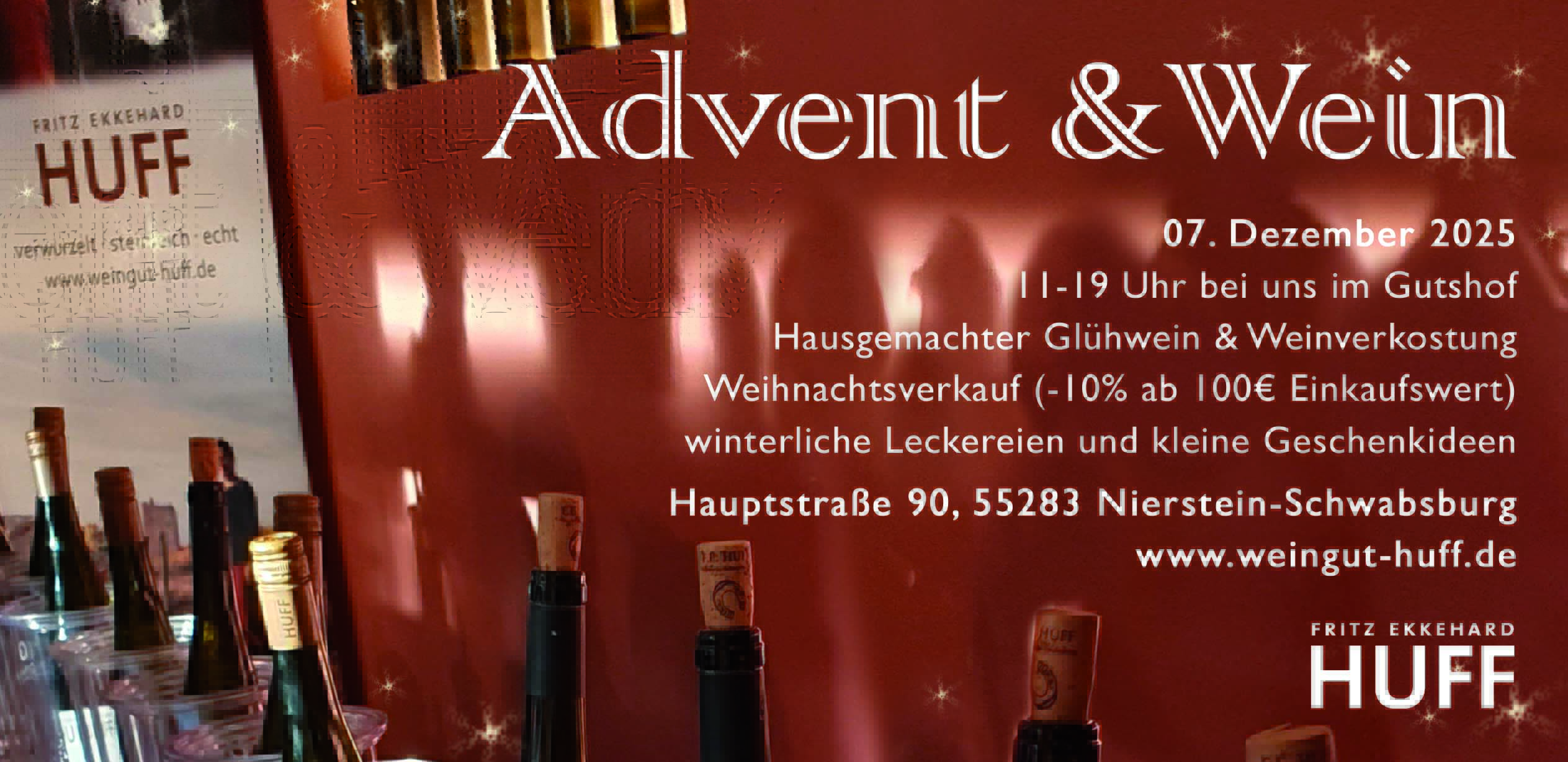 Weingut Fritz Ekkehard Huff Hauptstraße 90, Nierstein, Rheinland Pfalz, Germany07. Dezember 2025 - 11 bis 19 Uhr Advent & Wein Unsere Adventsverkostung ist ein vorweihnachtlicher Geheimtipp: gemütlich, stimmungsvoll und handgemacht! Von Niersteiner Honig, Wildspezialitäten, hausgemachtem Glühwein und Plätzchen von den Landfrauen, dreht sich hier alles um Genuss. Neben unseren leckeren Weinen finden sich originelle Geschenkideen wie zum Beispiel Hüte von Mechthild Smeisser. Unser idyllischer […]